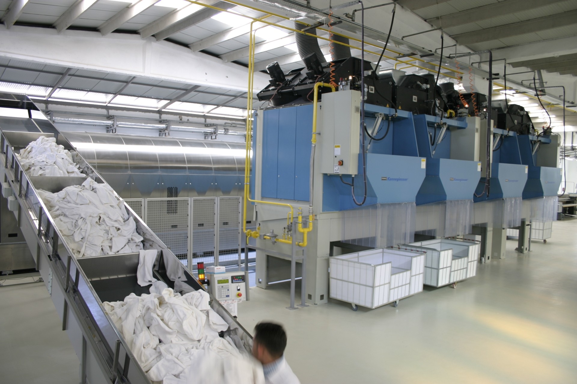 Permak Makina olarak Türkiye distribütörü olduğumuz ve tartışmasız olarak çamaşırhane makinaları ve sistemleri konusunda dünyanın en iyi ve prestijli markası Kannegiesser ile birlikte denim yıkama fabrikalarına yönelik geliştirdiğimiz otomasyonlu denim sıkma ve kurutma sisteminden bahsetmek isteriz. Sistemimiz otomatik yüklemeli santrifuj sıkma makinesi ve entegre dağıtım konveyörü ile senkronize çalışan 8 adet kurutmadan oluşmaktadır. Bu sistem ile sadece tek bir yükleme personeli ile saate 3000 adete kadar yaş pantolonun sıkma ve kurutmasını tamamlamayı garanti ediyoruz. Yani sistem sadece otomasyonla eleman sayısını düşürmüyor, bunun yanında proses sürelerini de çok ciddi azaltarak konvansiyonel makinelere göre ~%45'e kadar enerji tasarrufu da sağlıyor. 2-2,5 yıl gibi çok kısa zamanda yapılan yatırımı geri ödeyen sisteme yatırım yapan firmalar arasında Realkom, Şıkmakas, Akarteks, Enkay Moda ve Storm Denim gibi firmaları sayabiliriz.
